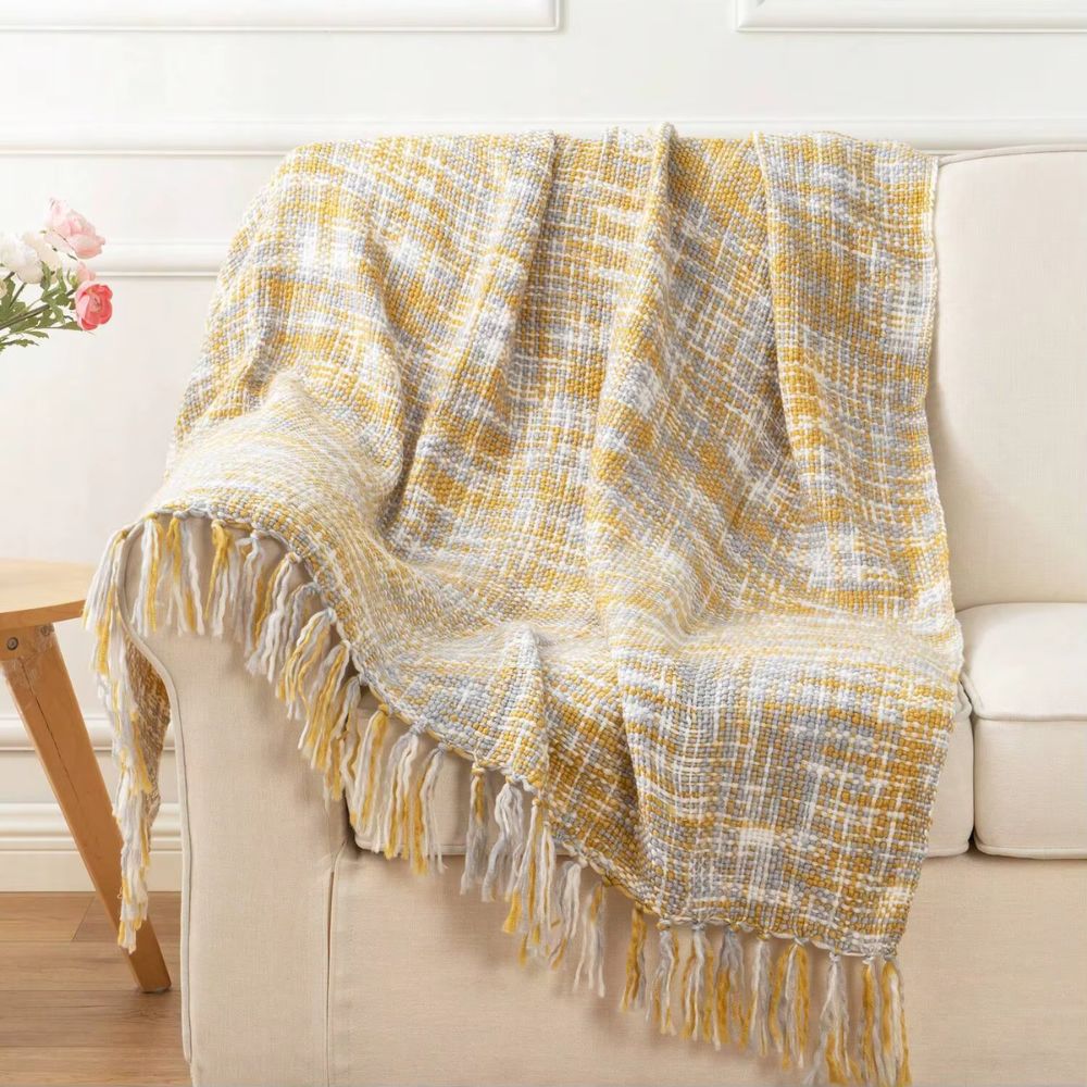 THIS YELLOW AND GREY SOFA BLANKET IS IDEAL AS A SOFA THROW OR BLANKET WITH ITS ACRYLIC WOOL. FOR MOMENTS OF WELL-BEING