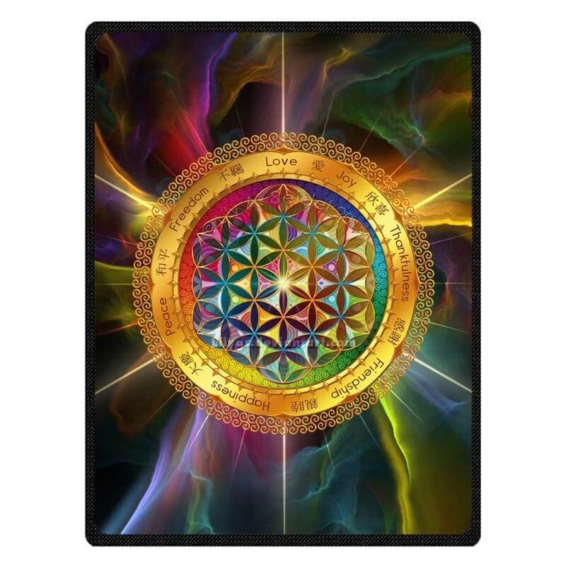 DISCOVER THE FLOWER OF LIFE BLANKET. IT WILL KEEP YOU WARM WHILE BEING BEAUTIFUL WITH ITS BRIGHT COLOR. IT IS COMPOSED OF A CENTRAL ETHNIC PATTERN IN SEVERAL COLORS THAT FORM A FLOWER OF LIFE.
